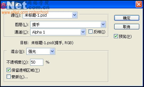 回到图层面板选择提手图层,然后在菜单栏中选择“图像”→“应用图像”命令,然后设置图层为提手,通道为Alpha1,混合模式为强光,不透明度为50%,勾选保留透明区域复选框。