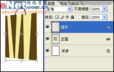 在图层面板中将提手图层和正面图层链接起来,然后按组合键“Ctrl T”将图像调整到如图效果。