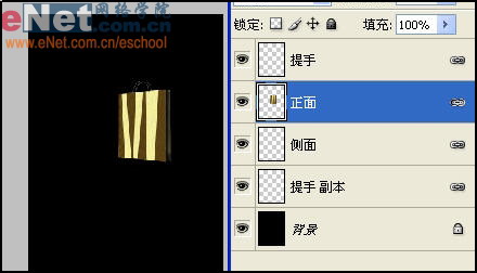 选择背景图层,填充为黑色,将所有手提袋图层链接到一起。使用组合键“Ctrl T”将其缩小,放到如图所示位置。
