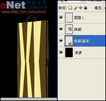 合并和纸袋有关的所有图层,重命名为纸袋,然后将其复制,命名为纸袋副本。选中纸袋副本,执行“编辑”→“变换”→“垂直翻转”命令,然后选中移动工具将副本图层移动到如图位置。