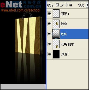 新建图层命名为散焦,将其置于纸袋和纸袋副本图层之间。在工具栏中选择渐变工具,使用黑色到透明渐变,做出一个如图效果的渐变图层。