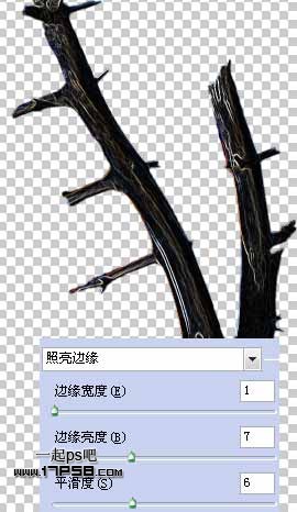 13、打开枯枝图片,去背景,拖入文档中,ctrl+J复制一层,滤镜>风格化>照亮边缘。
