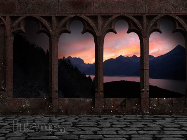11、在石柱图层的下面新建一个图层,使用颜色#000000的画笔工具涂抹下面红色的区域,制作出夜空的效果。注意降低画笔的不透明度和流量。