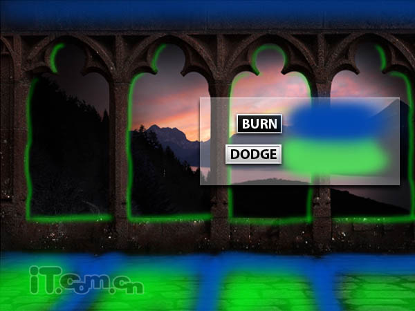 15、使用减淡工具涂抹下图绿色区域,使用加深工具涂抹下图蓝色区域,加强图片的光线和阴影效果。