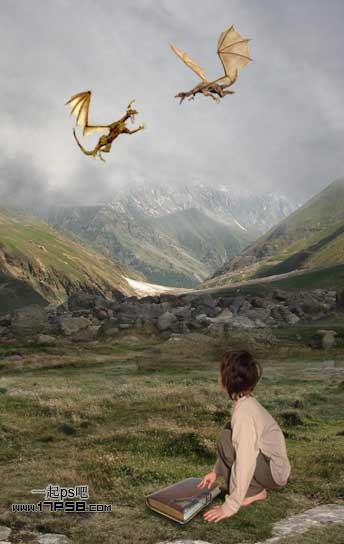 14、导入飞龙图片,处理一下饱和度和亮度。导入魔法书,添加阴影样式。
