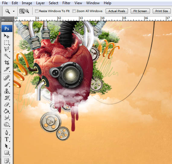 50、打开喷漆画笔包,选择画笔,用“[”键调整其大小,按住ALT键在心脏上选择一个暗红色,按CTRL