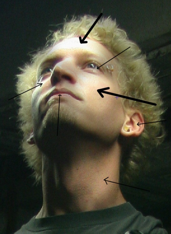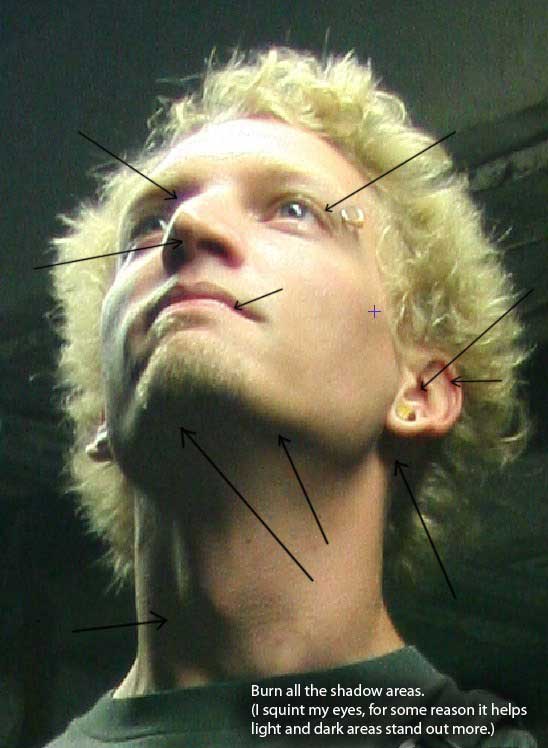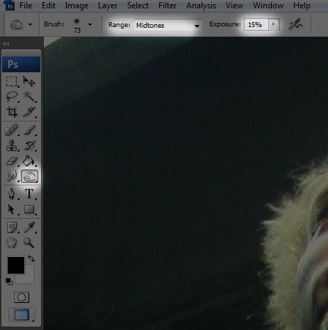 2、现在我们开始了,选择加深工具。设置为:中间调,曝光:15%。因为我们要做的是燃烧效果,所以要涂抹几下。在眉毛下的地区,下巴,鼻子,脖子的后面等地方涂抹。
