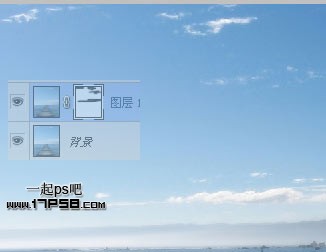 3、添加蒙版,用黑色笔刷涂抹,将背景层云彩露出来。