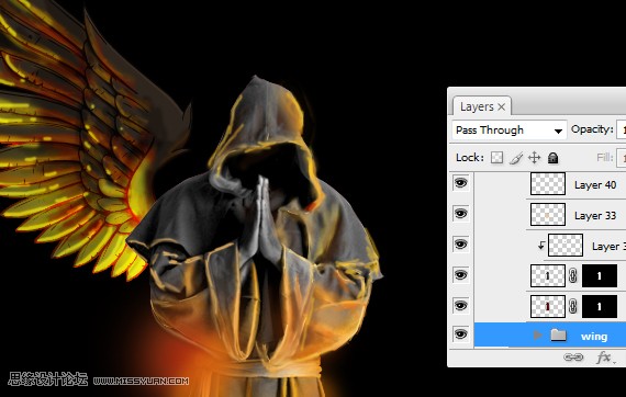 37、将“翅膀”图层组拖动到图层面板的新建按钮上,复制一次。按Ctrl+T(自由变换),选择水平翻转,将其放置到僧侣的右侧。