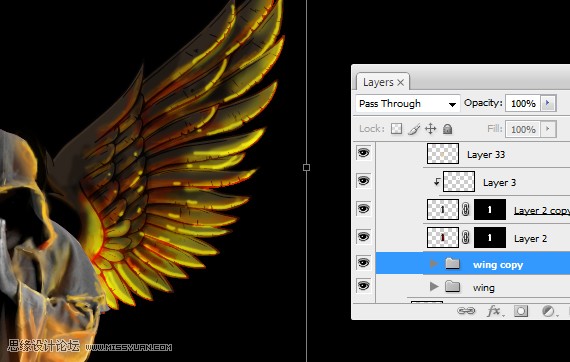 36、选中“翅膀”图层以及上面为它绘制的光效层,按Ctrl+G创建为一个图层组,命名为“翅膀”。