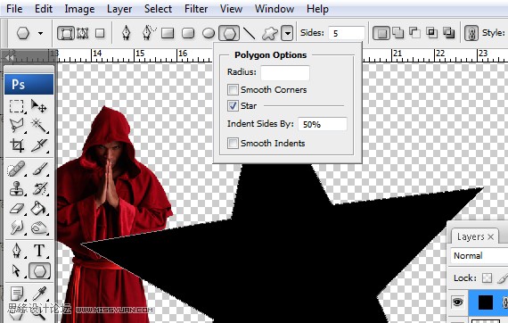 5、单击多边形工具(U),选项栏设置为形状图层,设置边数为5,打开选项菜单,勾选星形,绘制一个五角星。