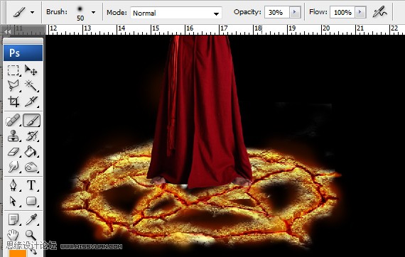 18、新建一个图层,单击画笔工具,选中圆形画笔,硬度为0,将其不透明度更改为40%,设置前景色为亮桔色,在裂缝上大致地绘制一次将笔尖缩小,选中亮红色,在裂缝的凹陷处进行绘制。将图层混合模式更改为“线性光”。