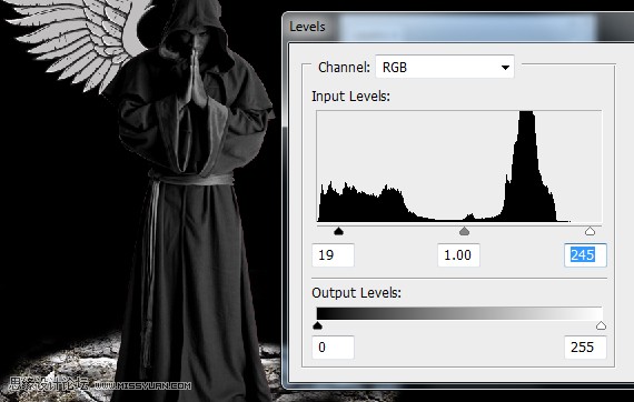 20、图像/调整/去色(Ctrl+Shift+U)将图像去色。图像/调整/色阶,进行对比度调整,设置如图。