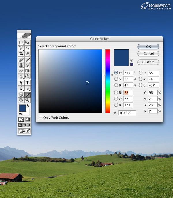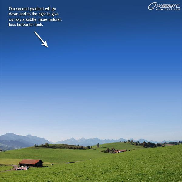 将前景色更改为蓝色,像我这样的蓝色(#2C6AC2)。使用渐变工具(G),从画布三分之一处向下拖拉渐变到山脉所在位置。