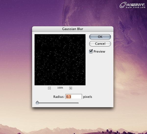 。执行滤镜>模糊>高斯模糊 ,然后调整半径为0.3像素,以此赋予星星一点微妙的效果,不让它们看起来很生硬。