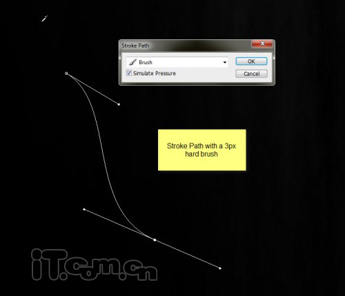 14、接下来我们开始为女孩制作头发。创建一个新图层,使用钢笔工具绘制下图所示的路径,接着使用吸管工具选择女孩头发深色的部分,最后选择钢笔工具在图片中单击右键选择描边路径,如图所示。