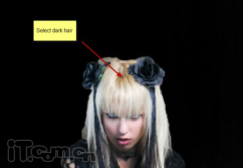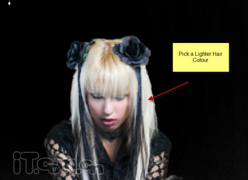 15、使用吸管工具吸取女孩头发颜色较浅的部分,如图所示。