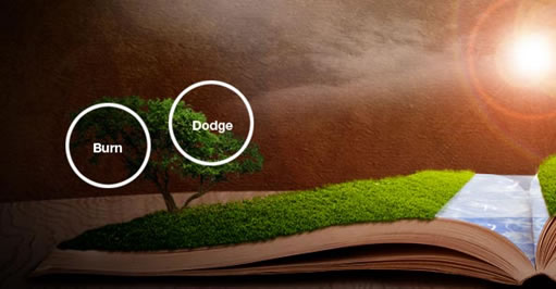 23、找一个绿树的素材,抠取一个单独的树,将其放置草地左边。使用变亮和变暗工将树面向光晕的部分提亮,背向光晕的部分变暗。