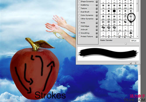 使用一个低透明度的笔刷,在苹果上取样颜色,使用画笔描边。(不要忘了涂抹高光使其符合整体图像的光线)