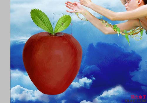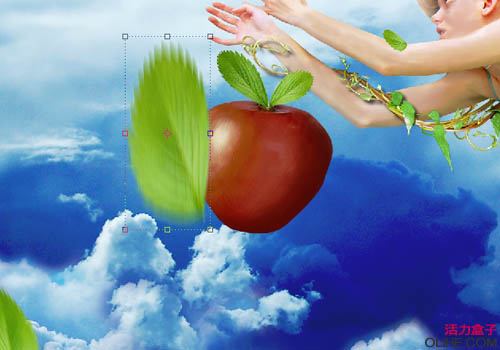 选择叶子,复制两次。使用变换工具让它们有一点透视角度,把它们放置在苹果的顶端,然后合并这3层得到一个完整的苹果图像。