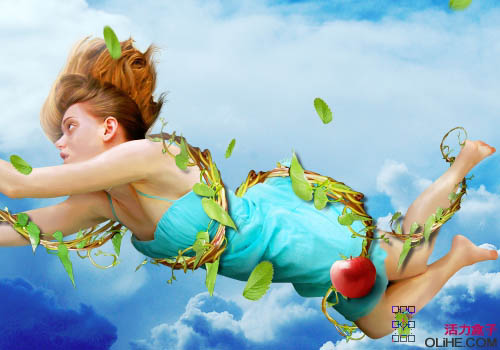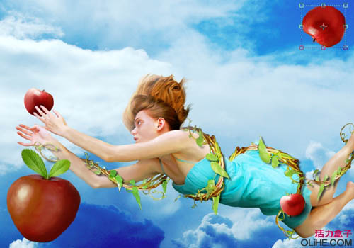 31、复制这两个不同的苹果图像,把它们放在女孩的周围..我们希望组合的有一些深度所以要确保苹果有不同的尺寸(越接近屏幕,它们应该越大)。按不同的角度倾斜它们,使它们看起来像是从空中坠落。