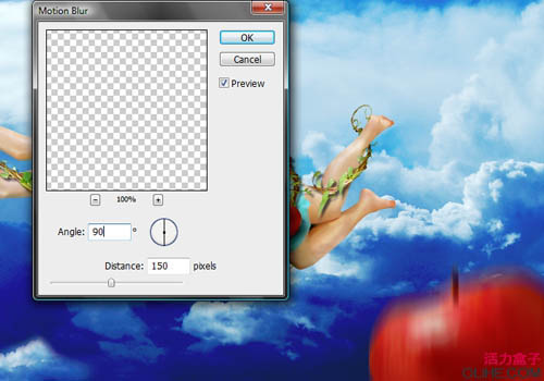 32、使用模糊给苹果添加更多的深度和运动效果。去滤镜>模糊>动感模糊,对大的苹果使用150像素的距离,小的苹果使用80px