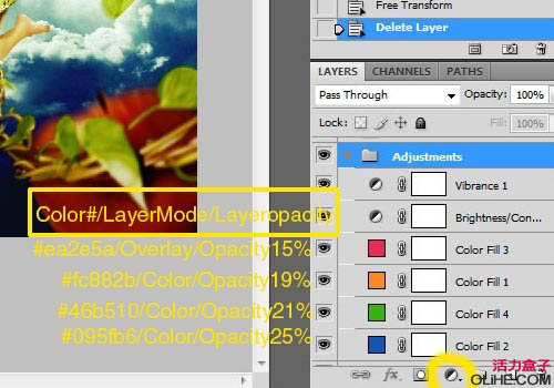 使用下面的一组颜色、混合模式和不透明度。有关调整组应如下所示: