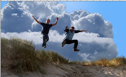 3、打开“云1”素材,粘贴到人物素材的背景图层下,并使用自由变换调整它的大小,如图所示。