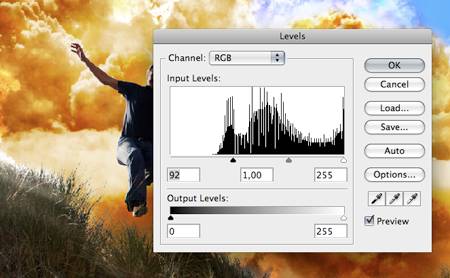 10、选择第一个云素材的图层,执行“图像—调整—色阶”,调整参考下图所示,加强爆炸的对比度和亮度,如图所示。