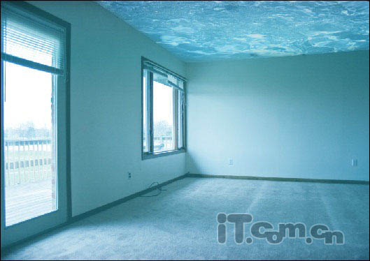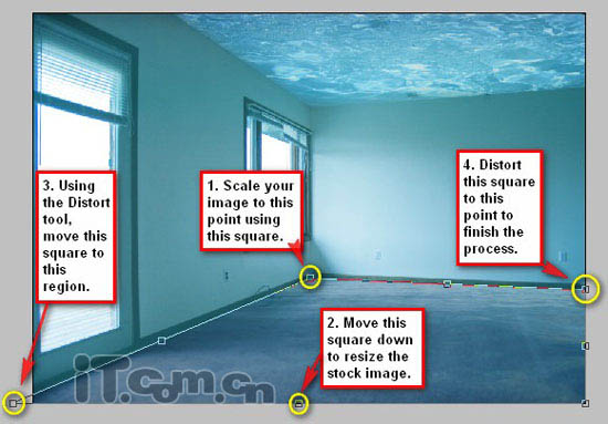 11、参考天花板的制作方法,使用扭曲命令调整海洋素材与地板重合,如图所示。