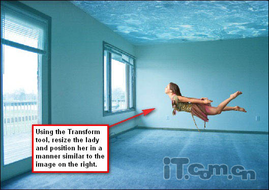 14、把抠出来的美女复制到图片中,并设置其位置一大小,如图所示。