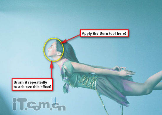 17、由于美女图层的亮度增加了,使得她的面部不好看,我们可以使用加深工具(曝光:15%)涂抹修复一下美女的面部,如图所示。